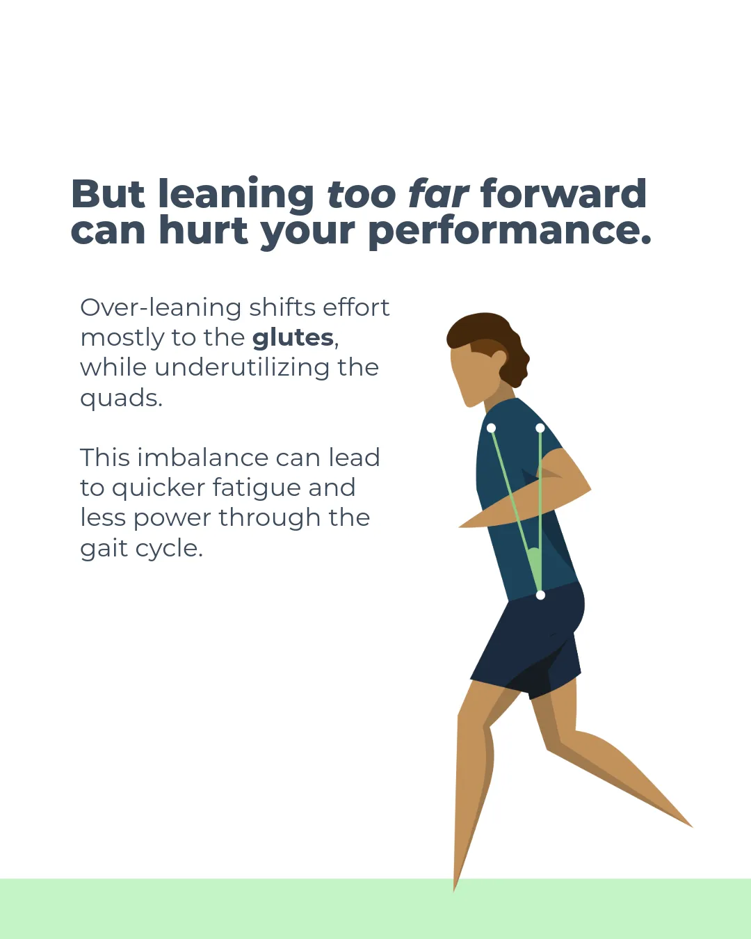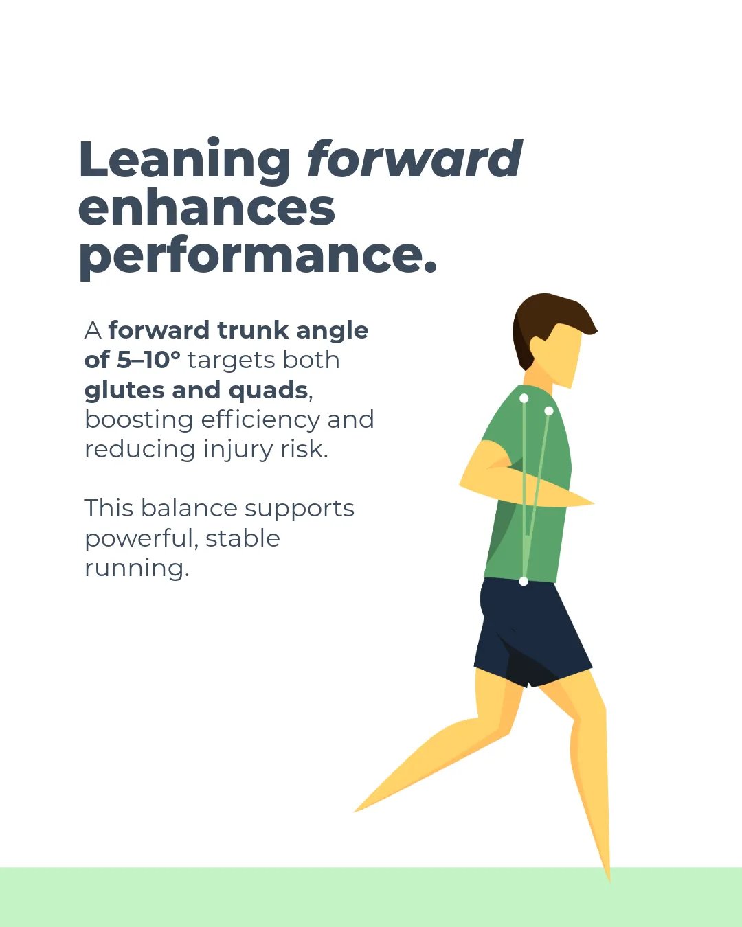 Forward trunk lean is more than just posture — it’s a biomechanical strategy that can change how your entire kinetic chain performs. A forward lean of 5–10° helps shift your center of mass slightly forward, allowing you to take advantage of gravity to initiate and maintain forward momentum. This positioning encourages your glutes and quads to work in coordination rather than relying too heavily on the quads alone, which is common in more upright runners and may contribute to anterior knee pain over time.