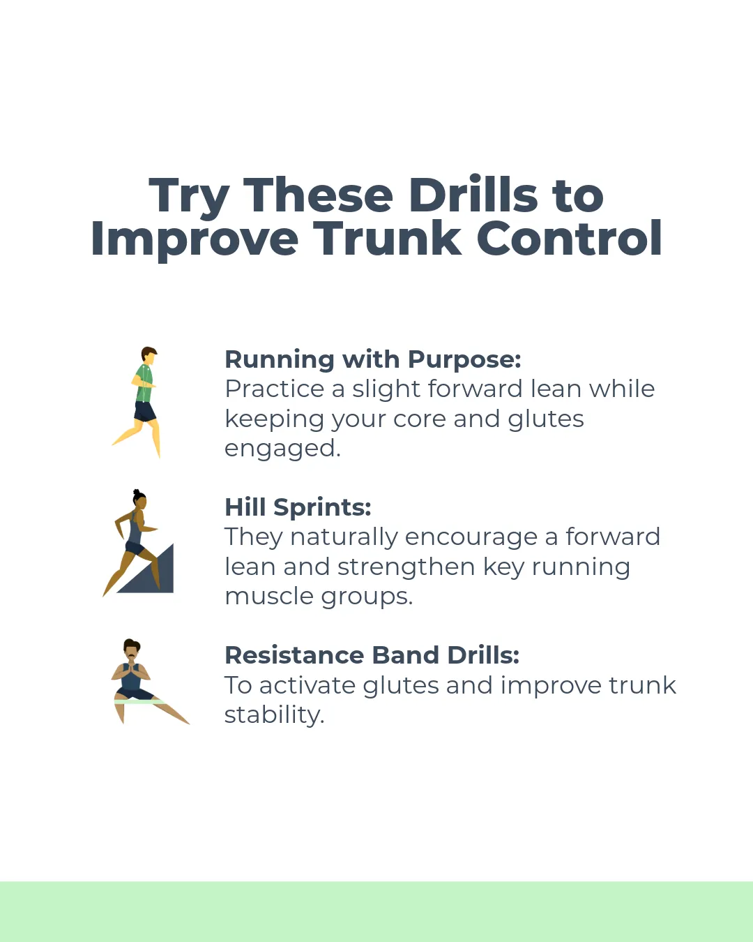 Addressing trunk position starts with awareness but requires targeted strength and mobility to make sustainable changes. Drills like resistance band marches or incline running emphasize glute activation and hip extension, which naturally promote forward trunk lean. Reinforcing this through core control (especially obliques and spinal stabilizers) ensures the trunk maintains alignment over thousands of strides.