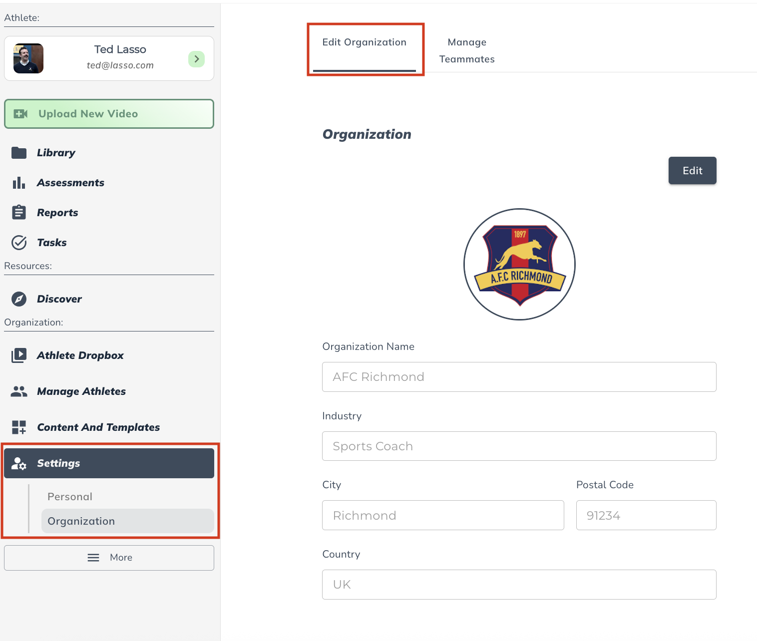 Organization branding can be edited in the web application by Admins. Navigate to Settings → Organization → Edit Organization.