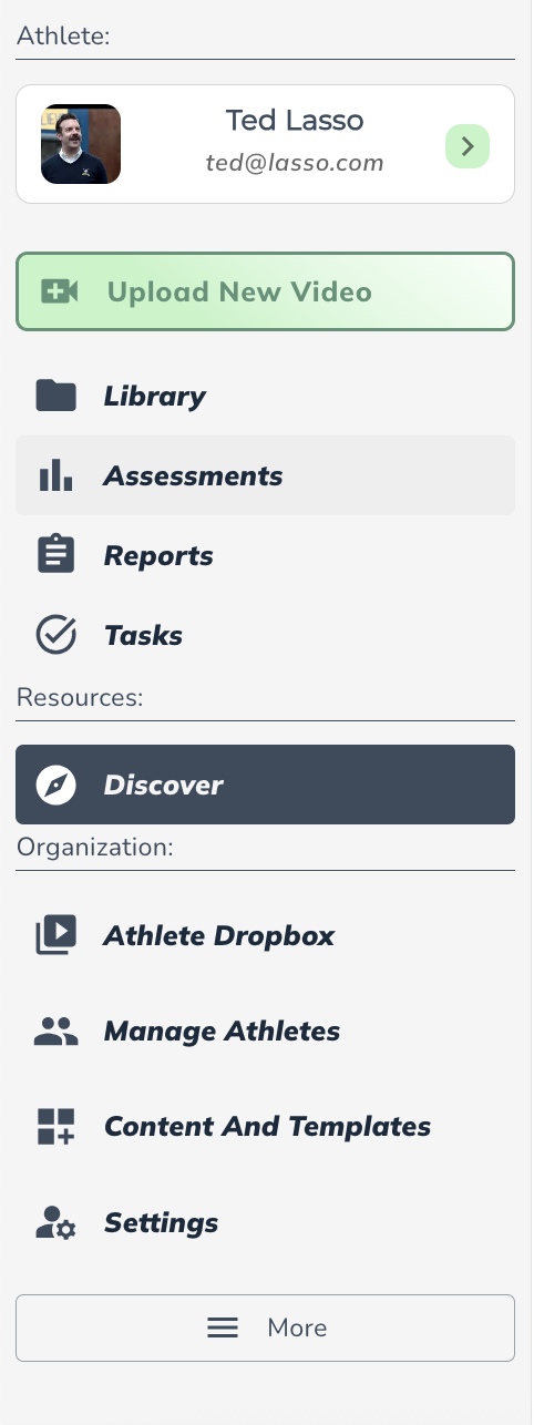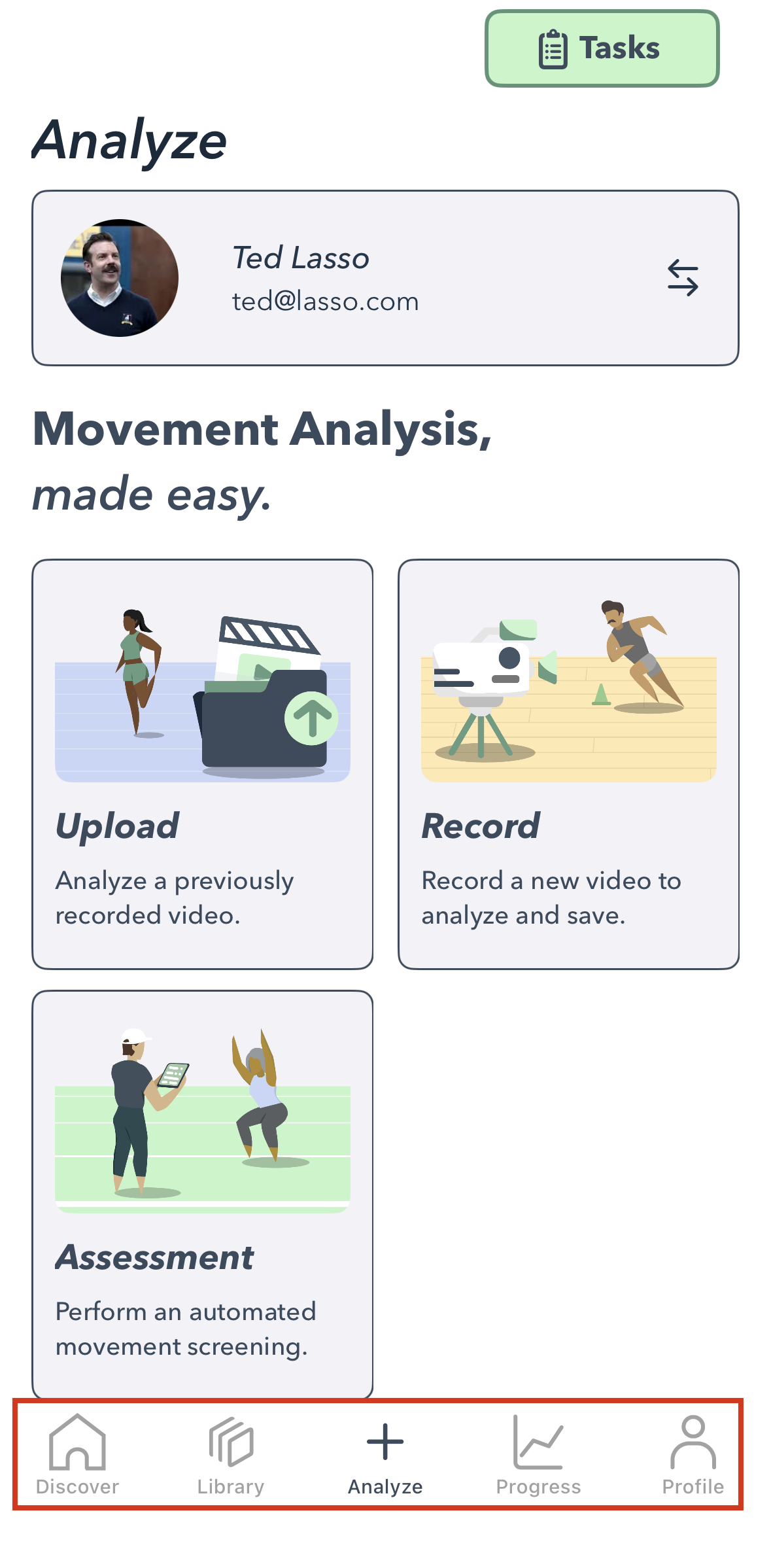 - Analyze: Choose the active athlete, perform an assessment or upload or record a video to analyze.