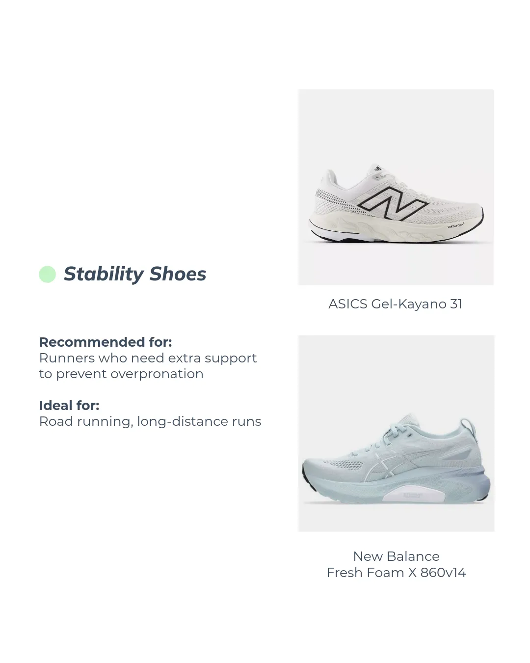 Stability shoes are built to support runners who overpronate—that is, those whose ankles roll inward excessively during the loading phase. This inward motion can contribute to knee or hip pain if left unchecked. Stability models like the ASICS Gel-Kayano or New Balance Fresh Foam X 860v14 provide medial support features that help guide the foot into a more neutral position. These are ideal for long-distance runs or everyday training where maintaining alignment over time is crucial.