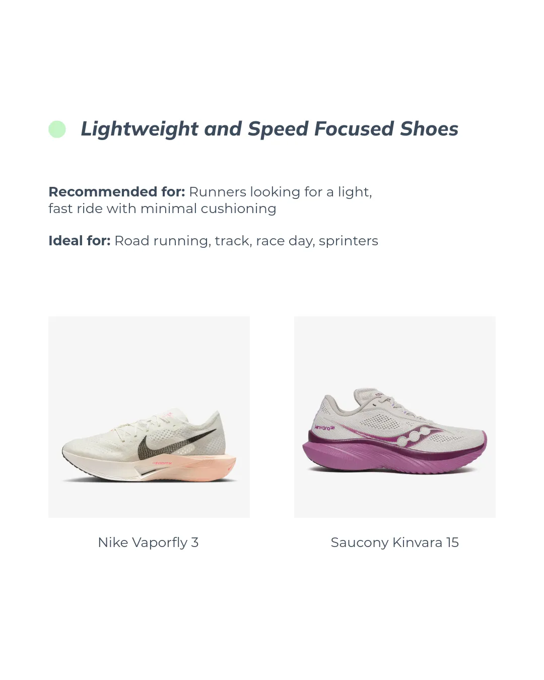 Lightweight shoes like the Nike Vaporfly or Saucony Kinvara are designed for quick turnover and minimal ground contact. Ideal for runners with forefoot or midfoot strike looking for performance on race day or track workouts.