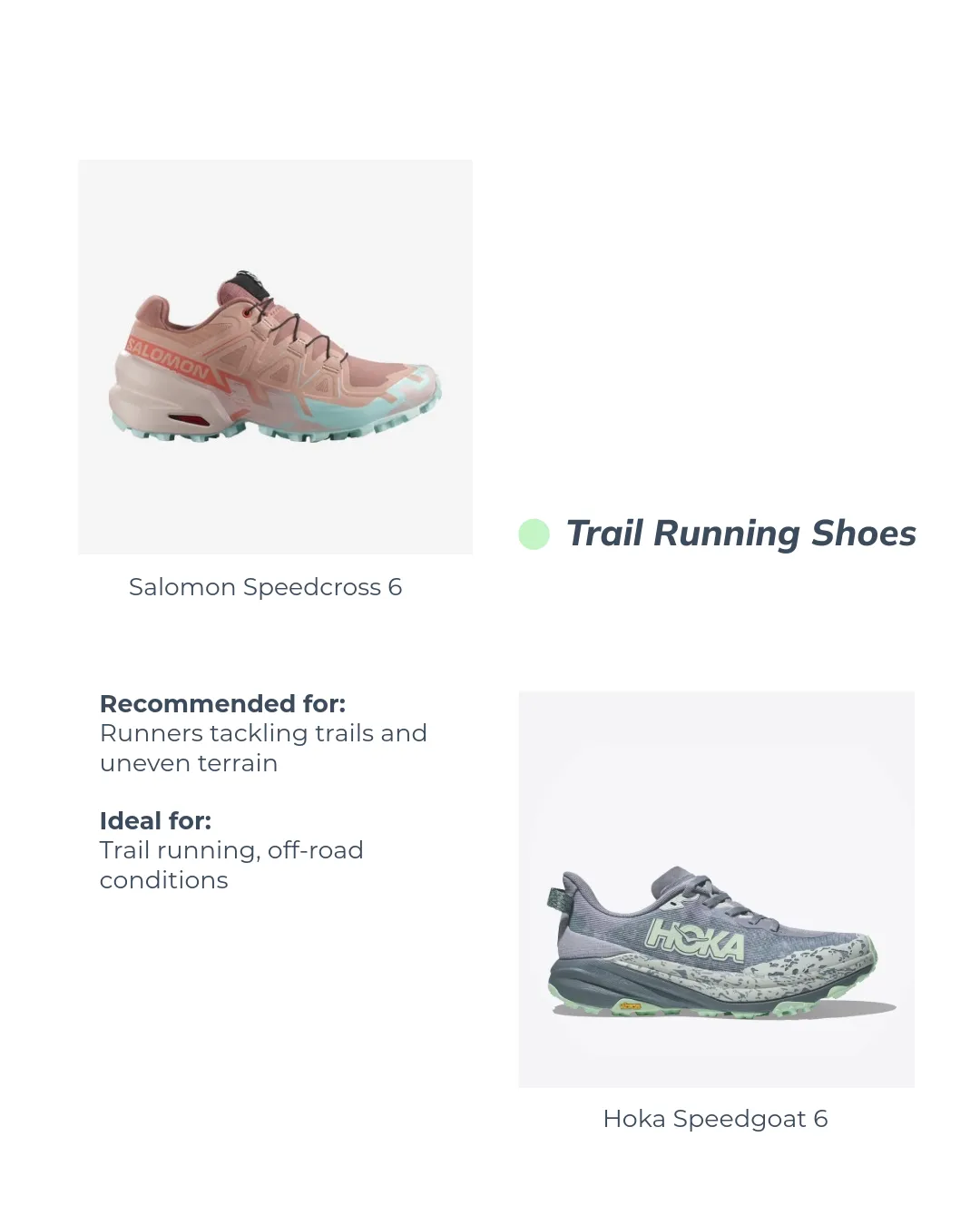 Runners hitting off-road paths need grip and durability. Trail shoes like the Salomon Speedcross or Hoka Speedgoat provide aggressive tread and stable structure for uneven surfaces—often supporting a midfoot strike pattern.